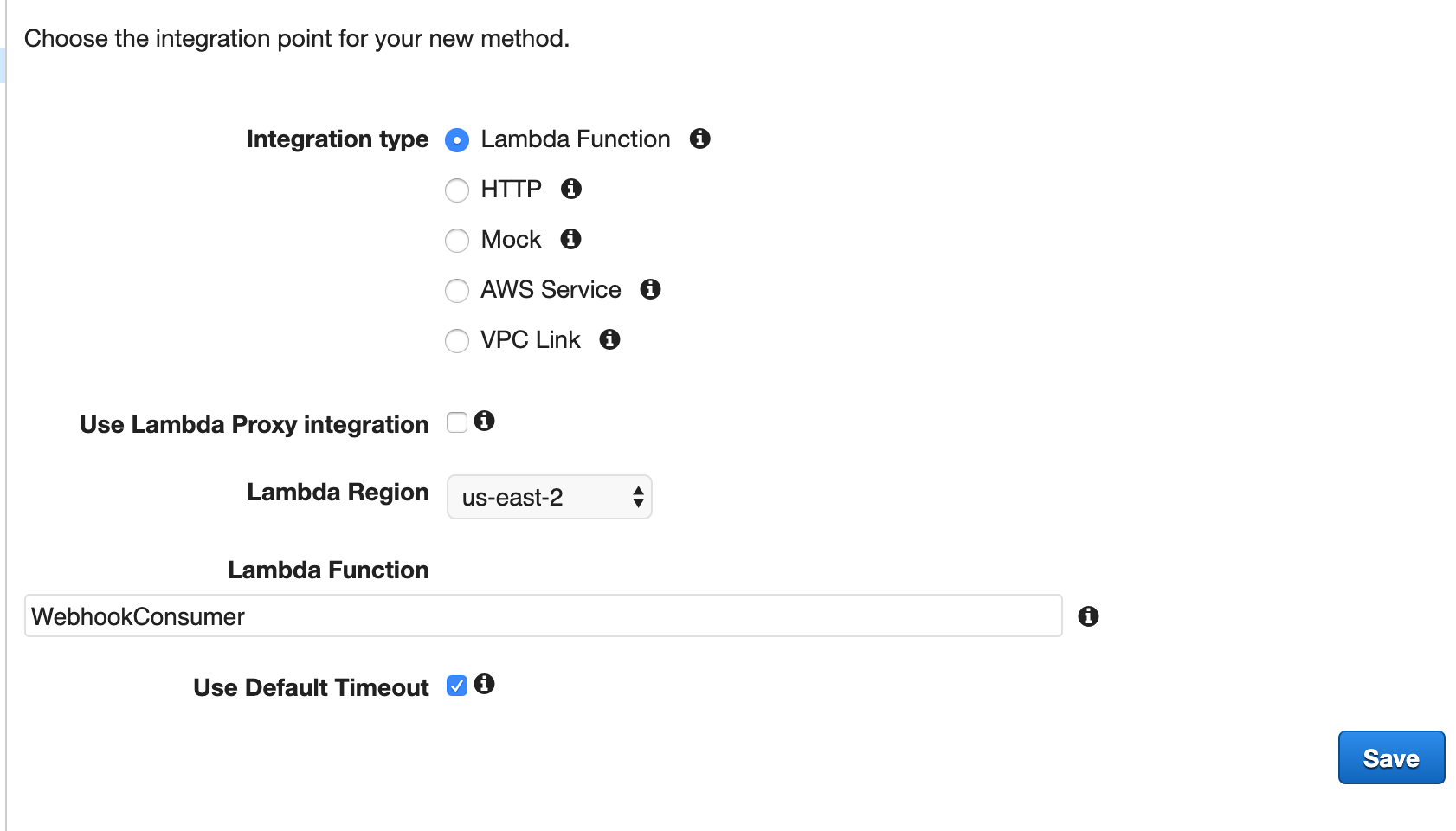 16. Click on your new created API Service, click the Actions list to add a POST Method Execution, select Lambda Function for the Integration type, and type the Lambda function name created previously.