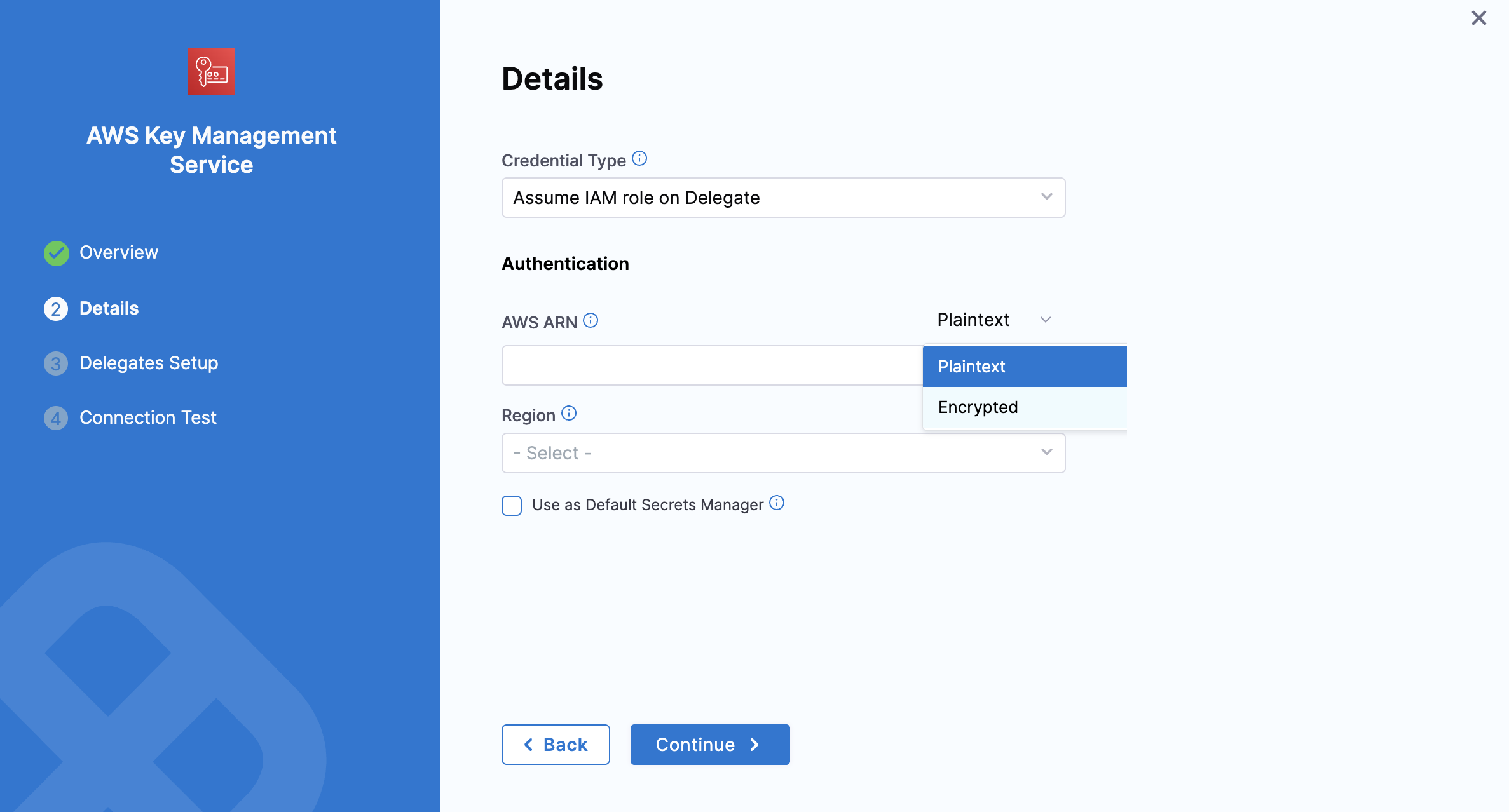 • AWS ARN: You can provide the AWS ARN as plain text or as an encrypted secret.